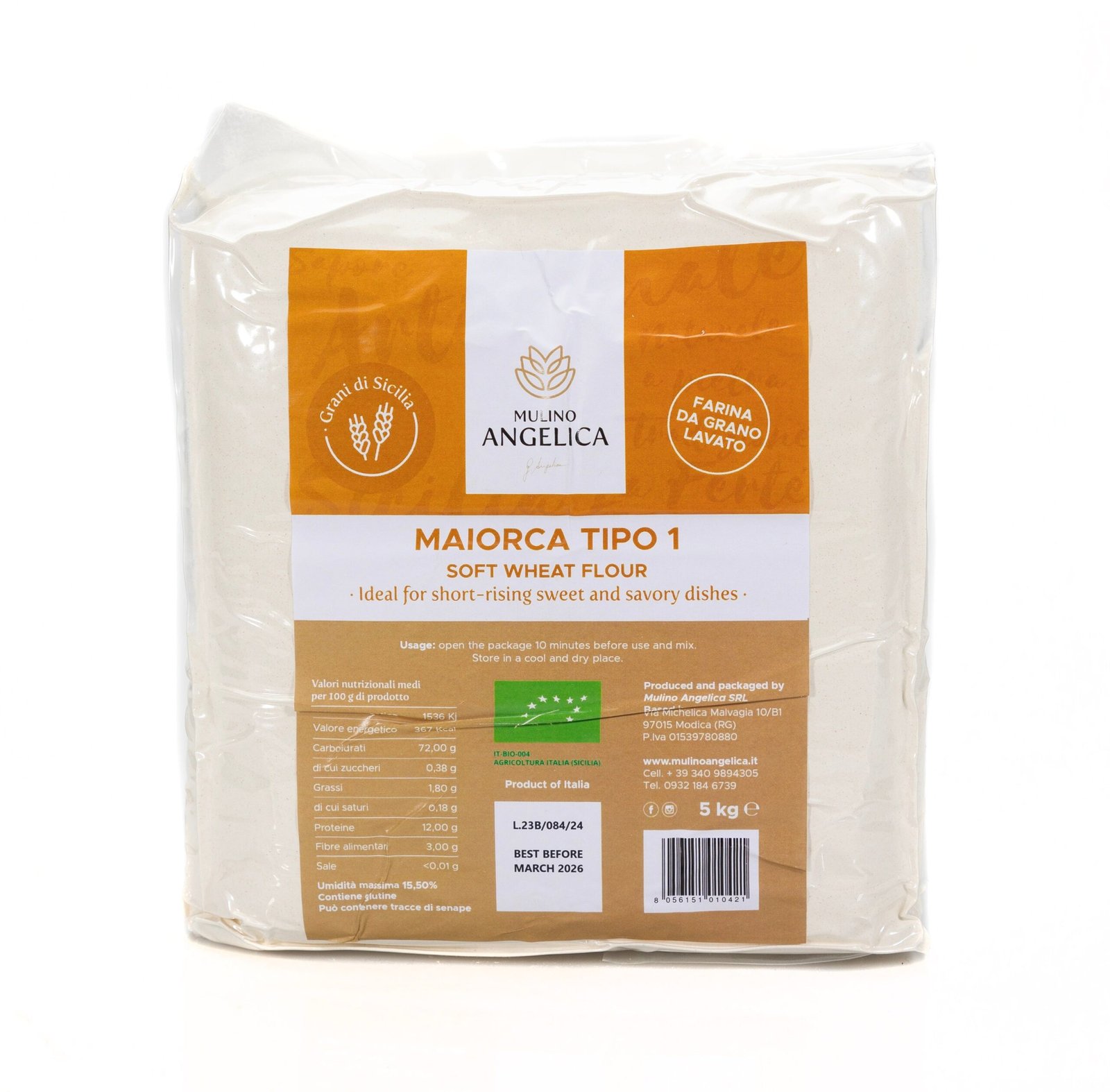 Mulino Angelica’s Organic Maiorca Type 1 Flour is a Sicilian ancient-grain, certified organic soft wheat, milled slowly with stone and gentle cleaning. It features fine, aromatic, easily digestible flour—perfect for cakes, biscuits, breads, pizzas, and sweet or savory treats.