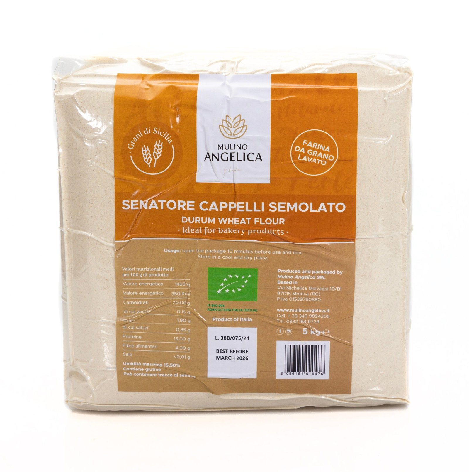 Mulino Angelica’s Organic Senatore Cappelli Semolato Flour is stone-ground from ancient Sicilian wheat, retaining the germ for added nutrition. This traditional milling process ensures a flour rich in flavor and suitable for artisanal baking.