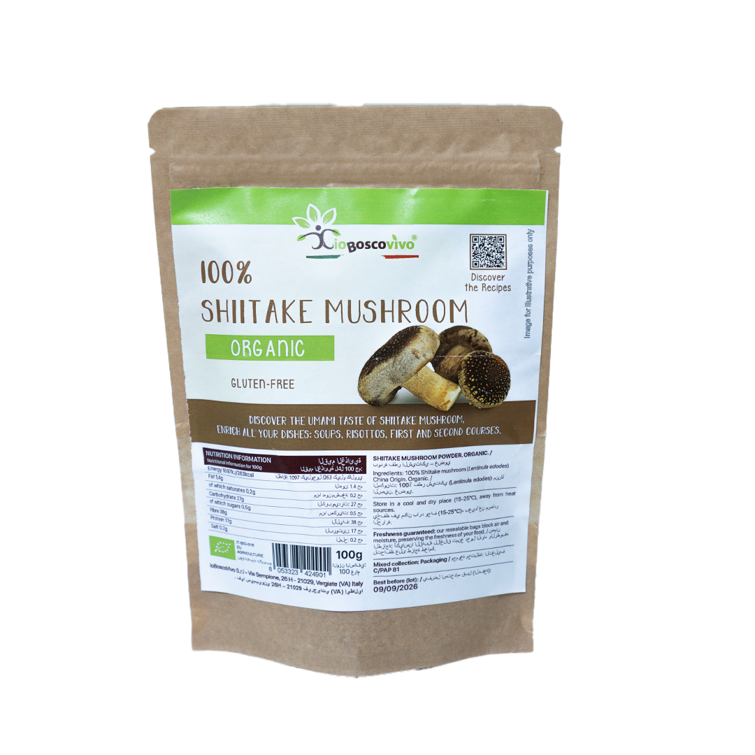 IOBOSCOVIVO Organic Shiitake Mushroom Powder 100g is a premium, finely milled superfood made from 100% European-grown shiitake mushrooms (Lentinula edodes), cultivated on oak wood for enhanced purity and vitamin D content—up to 300× more than conventional shiitake