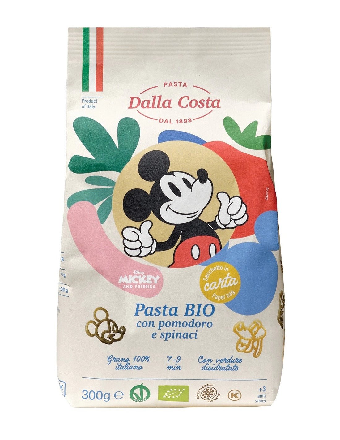 Dalla Costa Organic Mickey Mouse Pasta combines fun Disney shapes with nutritious ingredients. Crafted in Italy, it’s made from organic durum wheat semolina enriched with dehydrated tomato and spinach. Suitable for children aged 3 and above, it offers a playful way to enjoy a wholesome meal.
